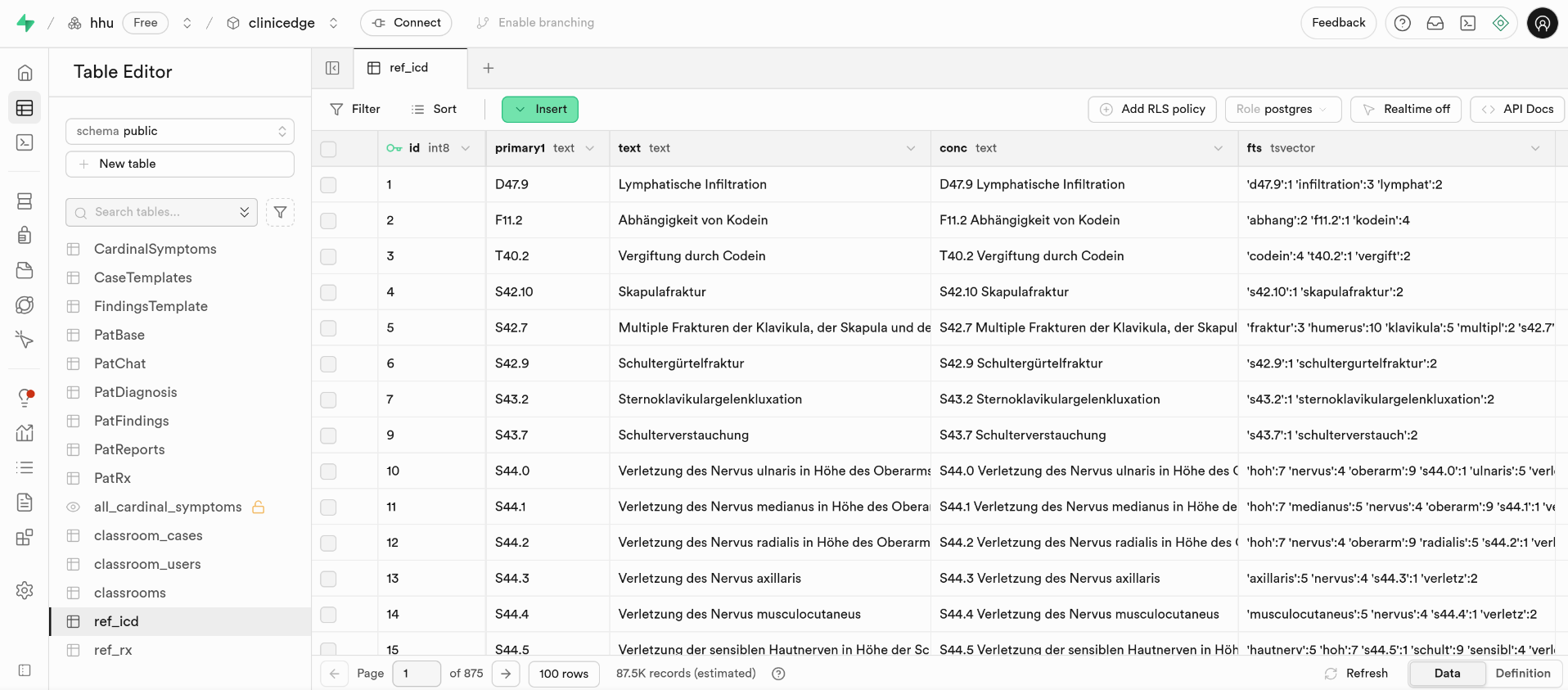 The ref_icd table in supabase stores the ICD-10 diagnosis codes and is referenced when a user assigns a diagnosis to a patient case.