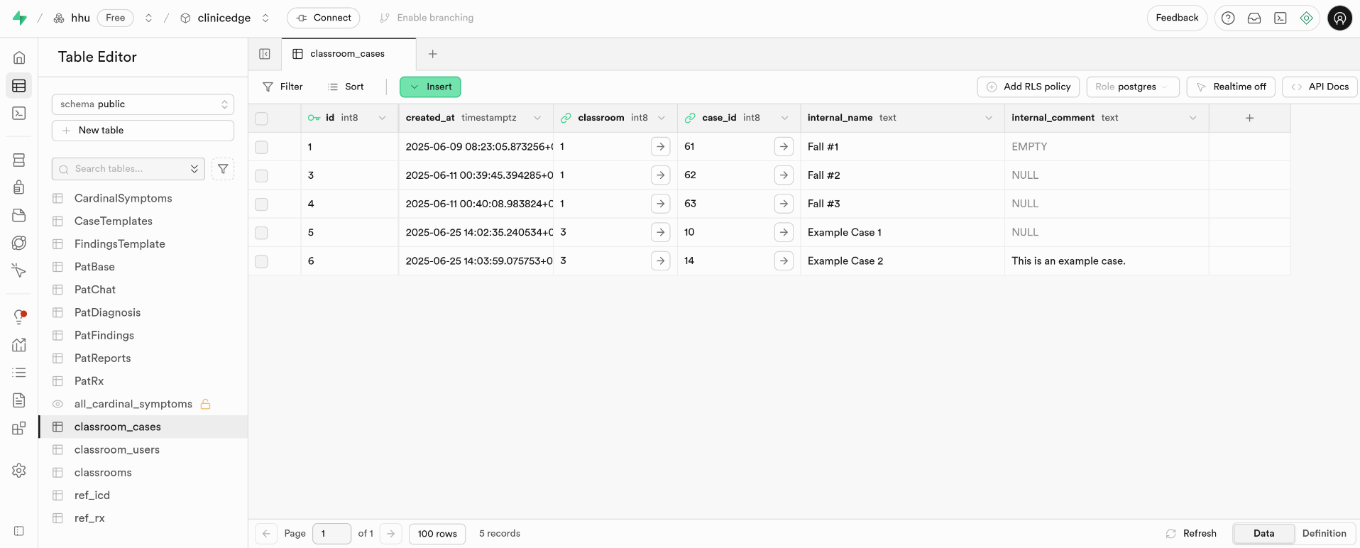 The classroom_cases table in Supabase stores the cases, which are assigned to classrooms.