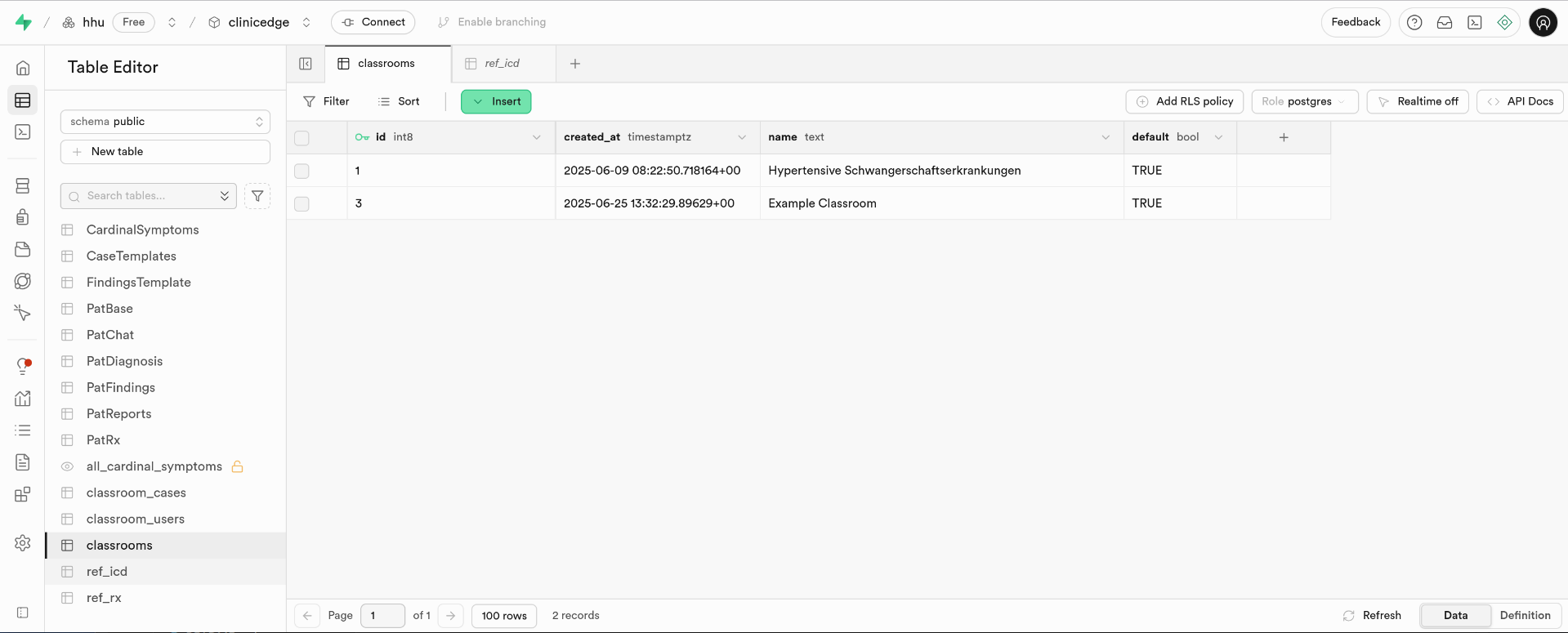 The classrooms table in Supabase stores the created classrooms, to which several cases can be assigned. To learn how to create a new classroom, see Section 5.4 How to Create a Classroom.