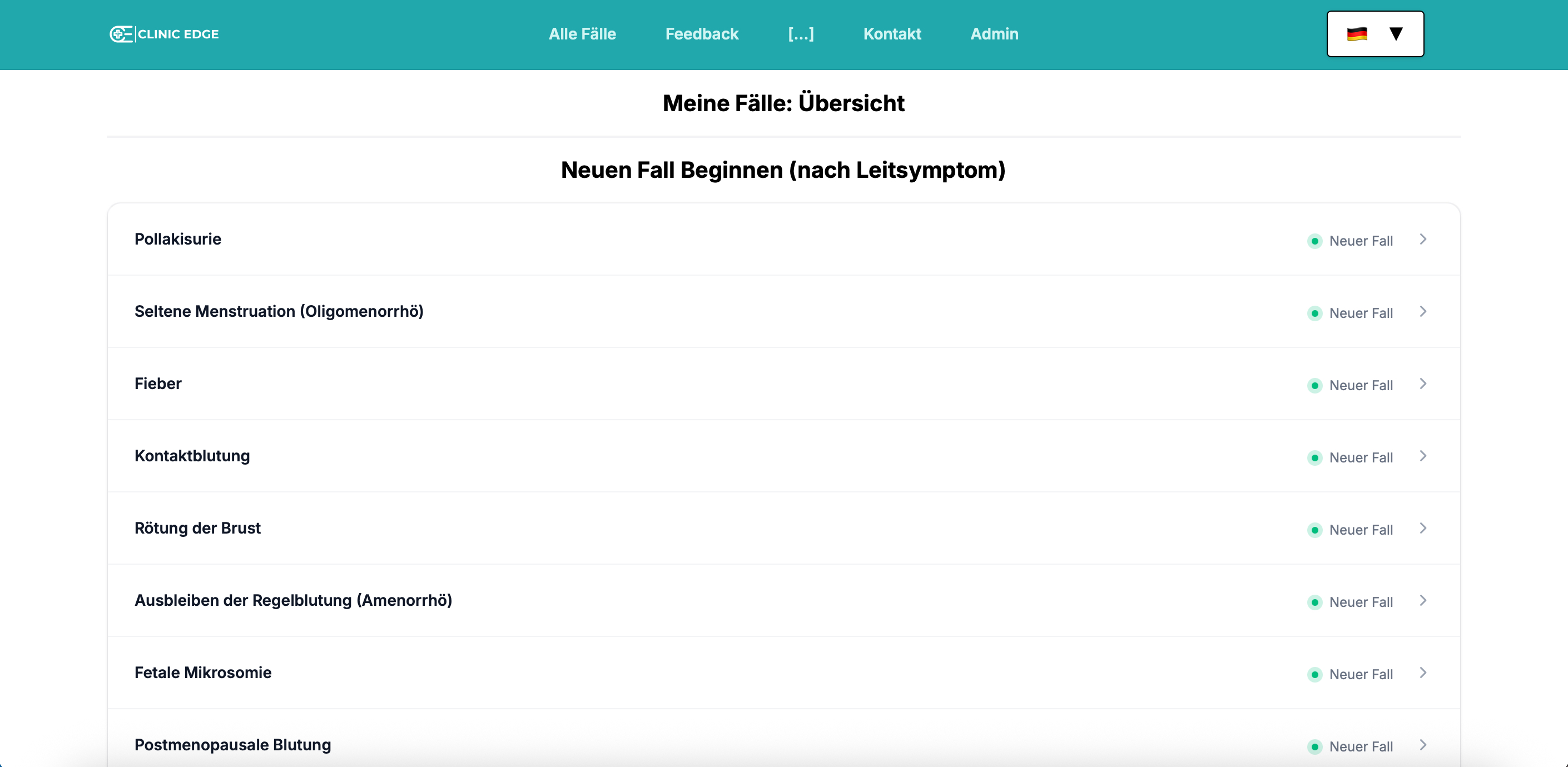 These cardinal symptoms are displayed on the Clinic Edge landing page, where users can select a symptom to receive a randomly generated patient case linked to that symptom.