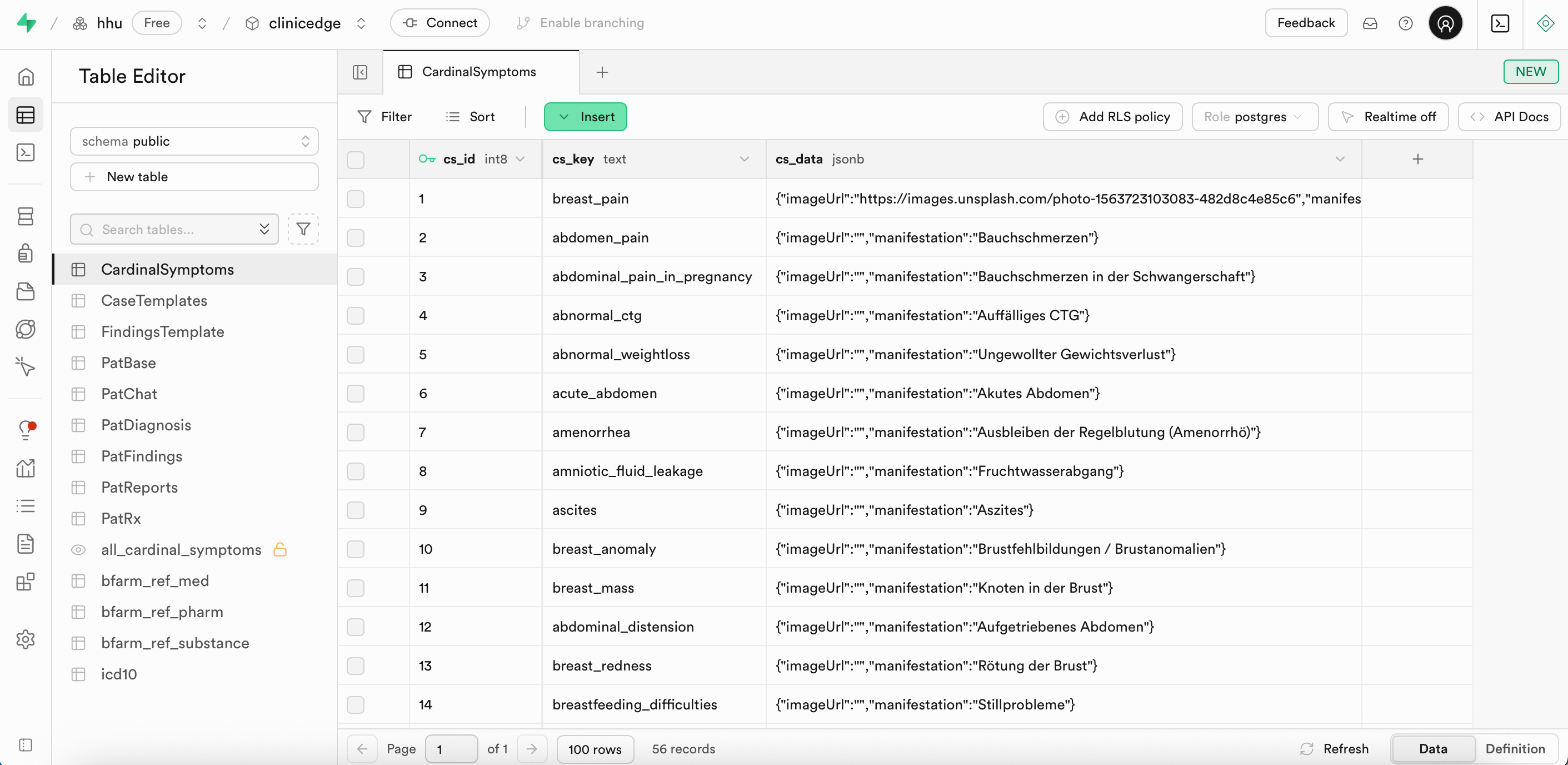 The Clinic Edge landing page is built upon the CardinalSymptoms table in Supabase, which stores the underlying data to display the list of symptoms. This table stores metadata for each cardinal symptom, including a display title (manifestation) and an optional image, both defined in the cs_data JSON field.