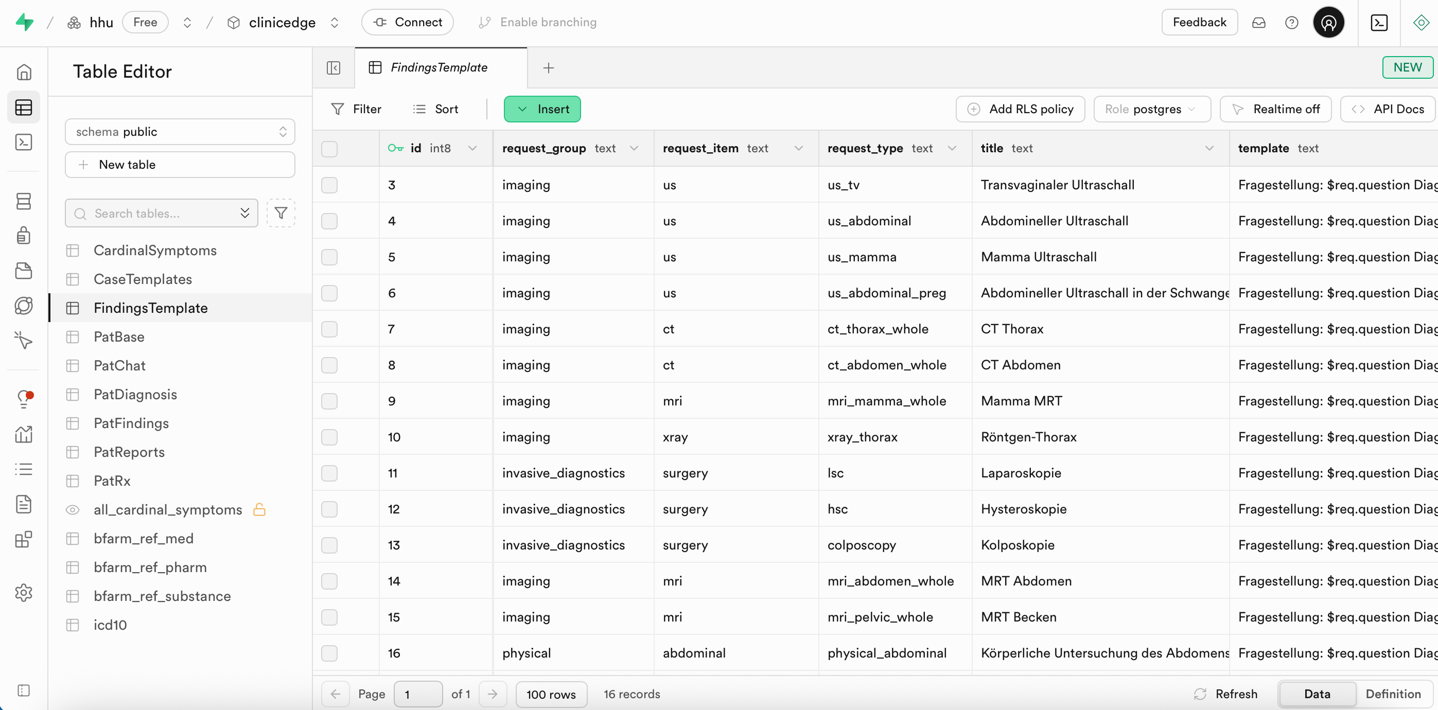 The FindingsTemplate table enables automated rendering of written medical reports. For each diagnostic method (e.g., ultrasound, physical exam, surgery), it defines how findings from pat_data within the PatBase table are converted into a structured report when the user requests a diagnostic examination.