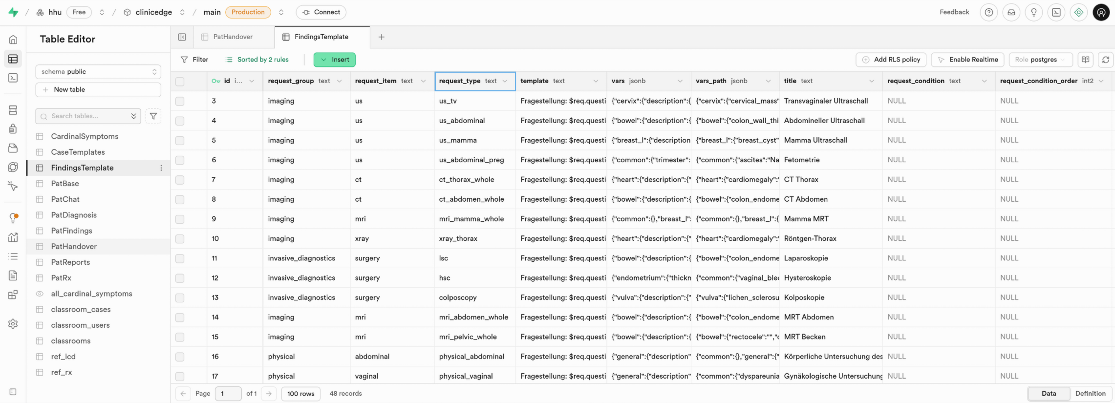 Each available diagnostic request (request_type) is represented by one row. Each row specifies the report layout (template), quantitative and qualitative parameters (vars), and text-mappings for pathological or abnormal findings (vars_path).