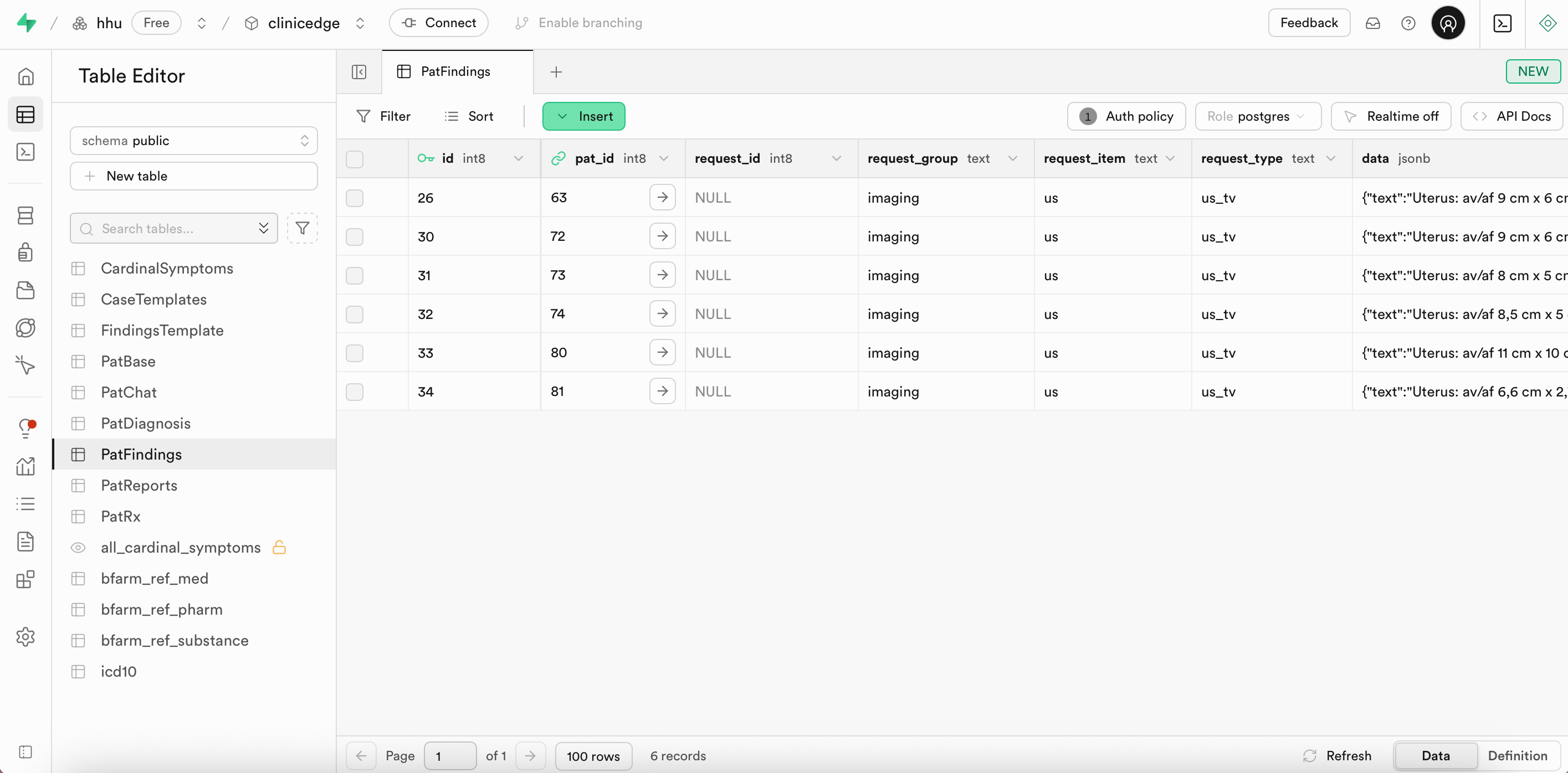 The PatFindings table in Supabase contains all diagnostic findings requested by the user for each patient case. Every diagnostic request is represented by a single row and inludes the examination group, item, and type, as well as the generated report. Each finding is linked to the corresponding patient via pat_id.
