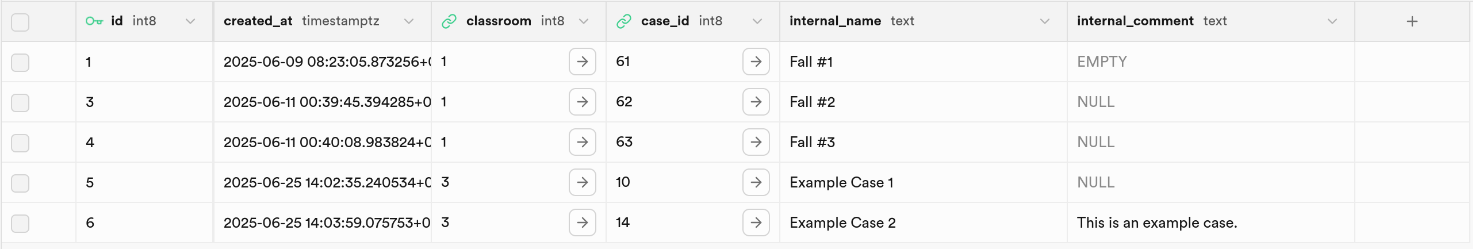 classroom_casesfor each case you want to add to your classroom. - Insert the ID of your classroom in the column