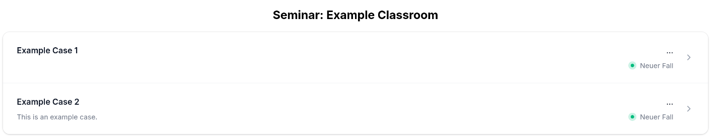 Besides creating individual cases, Clinic Edge offers the functionality to create classrooms. A classroom can be used to group several existing cases, that you want to use for your upcoming seminar. This way, it is more manageable for your students to find the specific cases, they need to work on. You can see in the graphic below, how a classroom is depicted in the case overview in Clinic Edge.